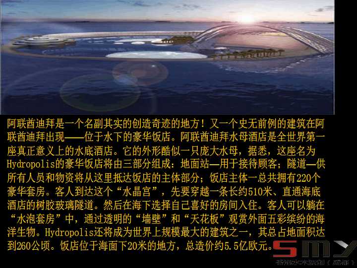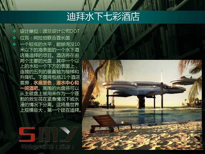【德陽水木源創酒店裝飾設計公司】世界第一家七星級酒店(帆船酒店)、世界最高的摩天大樓(哈利法塔)、全球最大的購物中心、世界最大的室內滑雪場等具有標志化建筑物的現代化的大都市——迪拜酋長國。這里是富人的天堂,在這里只有你想不到的沒有你見不到的奢華層度。下面我們就來感受一下迪拜的這座水下酒店的風光魅力:
