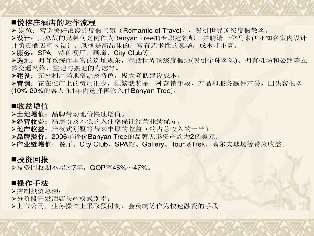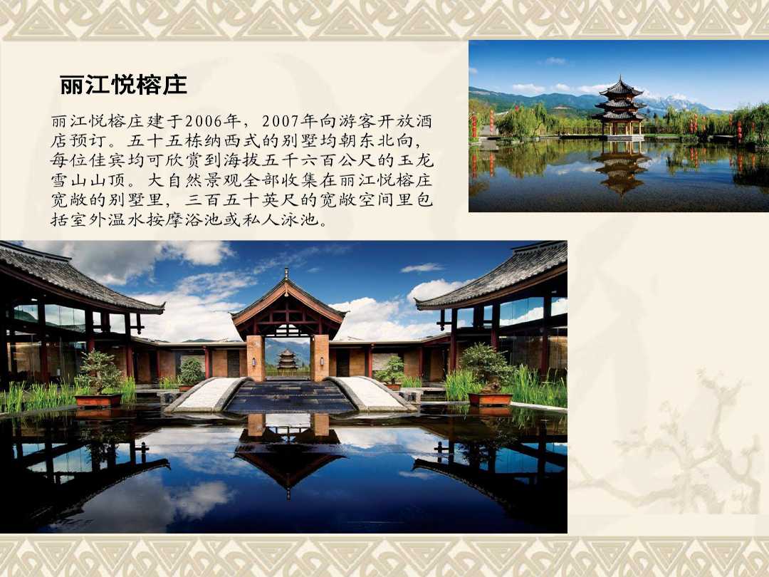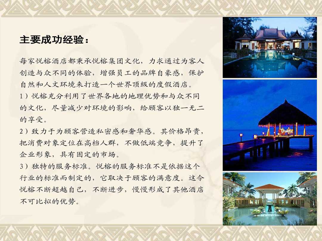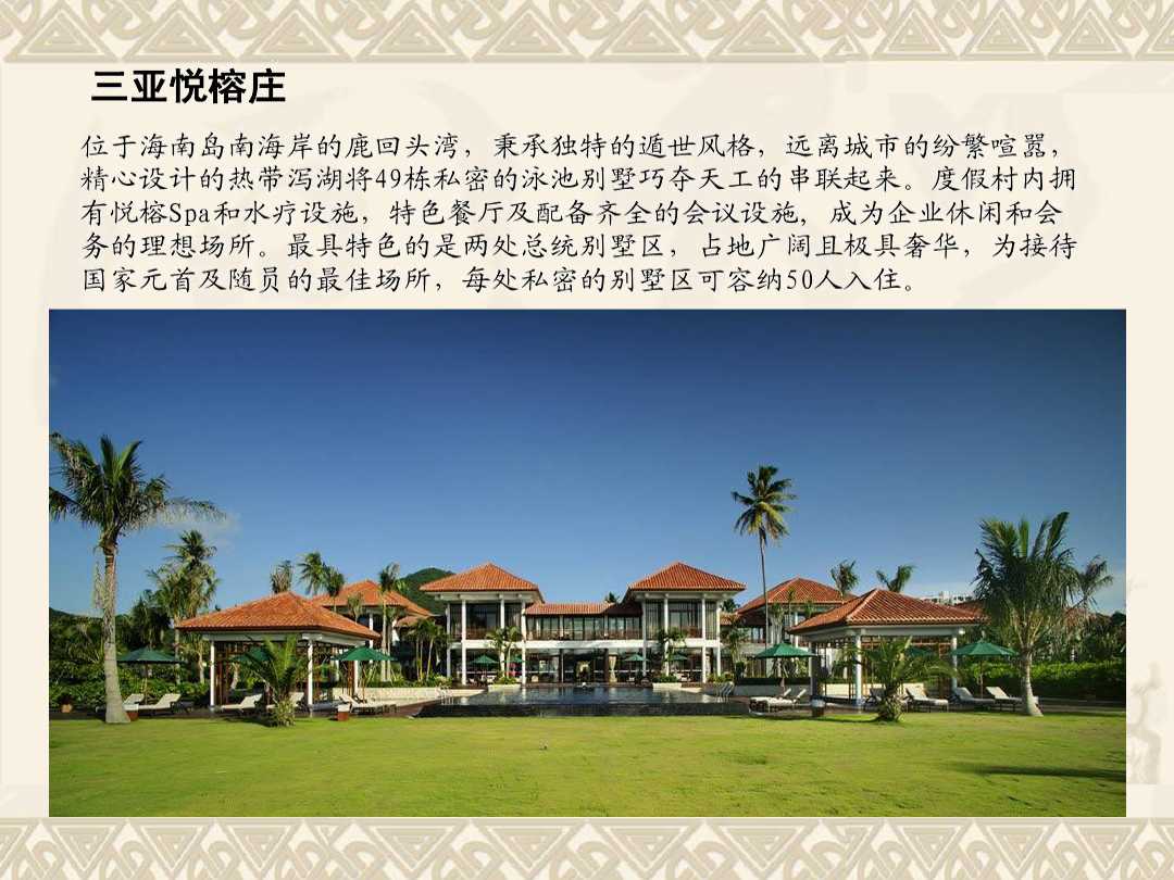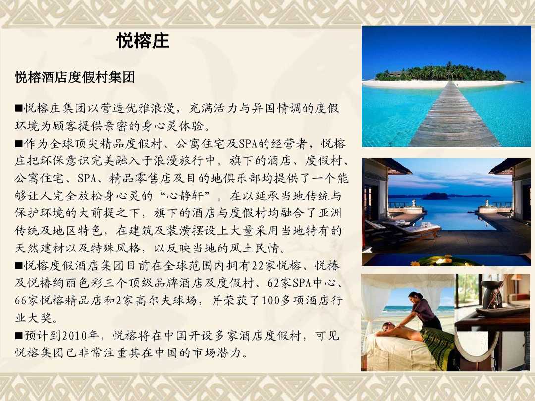 發(fā)布人:水木源創(chuàng) 發(fā)布時(shí)間:2019.03.13悅榕集團(tuán)為度假村、酒店及Spa的國(guó)際營(yíng)運(yùn)開發(fā)商。作為全球精品度假村、公寓住宅及Spa的營(yíng)運(yùn)商,悅榕莊把環(huán)保意識(shí)融合于浪漫旅行中。旗下酒店、度假村、公寓住宅、Spa、精品零售店及目的地俱樂部均提供了一個(gè)能夠讓人完全放松身心靈的“心靜軒” 。