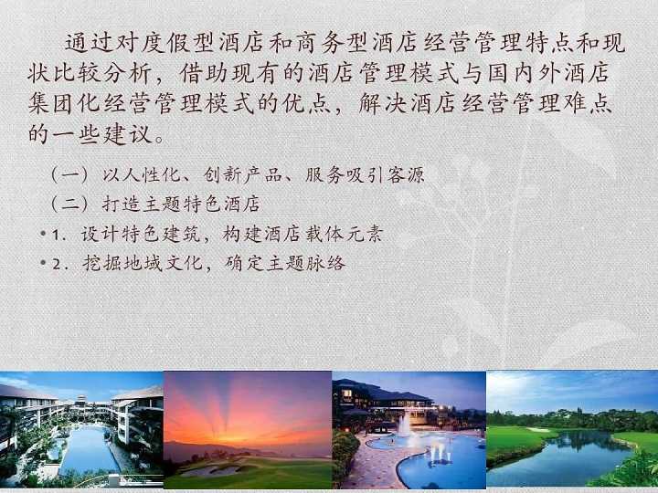 目前,在市場(chǎng)上的酒店可謂是琳瑯滿目、層出不窮,各種商務(wù)酒店、度假酒店、精品酒店、主題酒店分得出酒店類型的和分不出酒店類型的比比皆是。那么,對(duì)于商務(wù)酒店和度假酒店兩者之間您又了解多少呢?