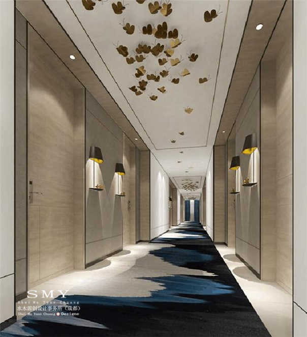 走廊時同樣使用的藍黃色調,酒店設計原則之一就是保證酒店風格的統一,走廊不規則的圖案便于大堂的圖案相一致,燈光彩用黃色燈罩來遮光,避免了燈太亮的刺激感,同時增加了舒適感;走廊的頂上使用金黃色的蝴蝶裝飾點綴,如同漫步在天空與海洋之間一樣,有一絲活潑俏皮的感覺。