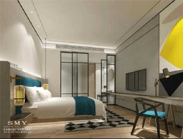 本案商務酒店設計了五種房型:大床房、大床房暗房、標準間、圓床房以及總統套房。五種房型的設計都很簡約,藍色與黃色使用的相得益彰,在加上墻上的一幅畫讓整個房間都不顯單調,使房間設計更加時尚。