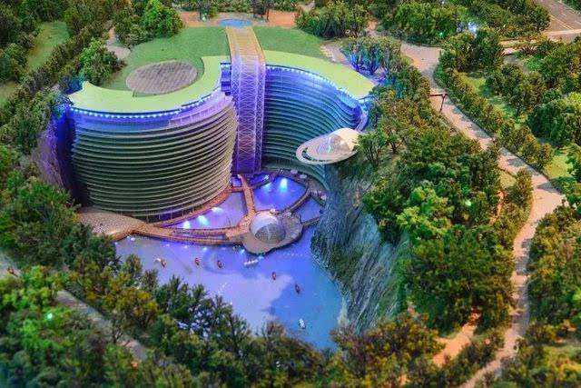 上海佘山世茂洲際酒店(又名:世茂深坑洲際酒店),位于上海市松江國(guó)家風(fēng)景區(qū)佘山腳下的天馬山深坑內(nèi),由世茂集團(tuán)投資建設(shè),海拔負(fù)88米,于采石坑內(nèi)建成的自然生態(tài)酒店。酒店遵循自然環(huán)境,一反向天空發(fā)展的傳統(tǒng)建筑理念,下探地表88米開(kāi)拓建筑空間,依附深坑崖壁而建,是世界首個(gè)建造在廢石坑內(nèi)的自然生態(tài)酒店。