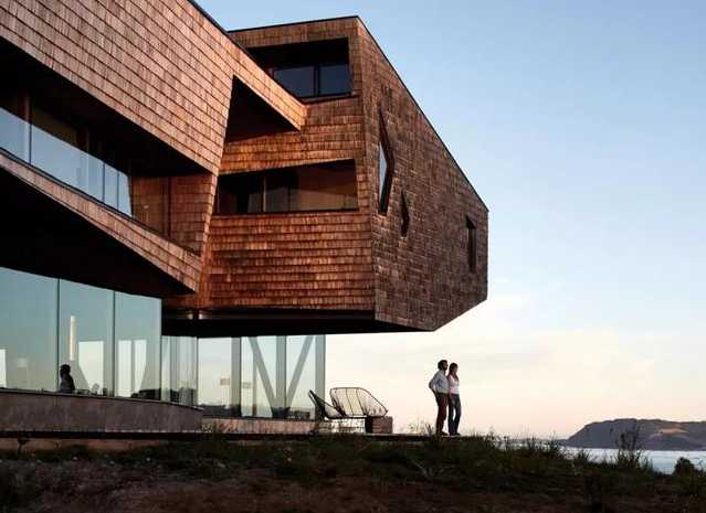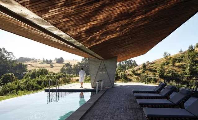 酒店位于智利Chiloe群島的一個青草山上,建筑的設(shè)計靈感來源于當(dāng)?shù)馗浇鼩v史悠久的木制教堂,因此整體主要用木材來建造。同時為了能讓客人們看到周圍的美景酒店在休息區(qū)、客房和地下的spa區(qū)等都設(shè)有落地窗。