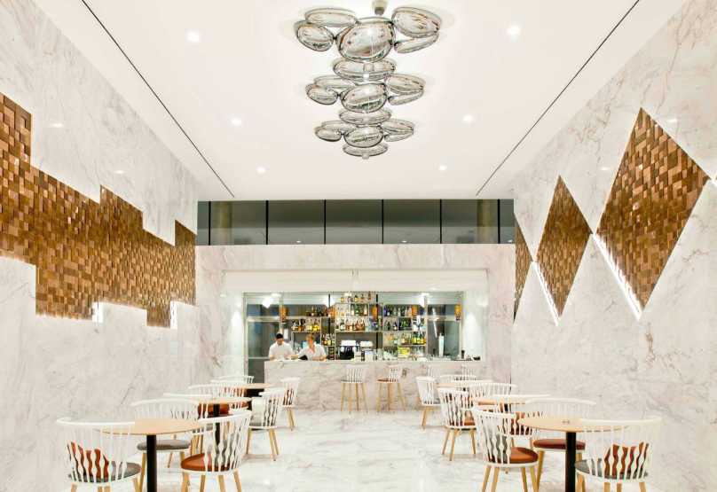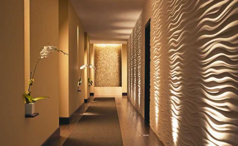 酒店墻面設計可分為內墻和外墻,外墻要與室外環境接觸,除了承重要求外,還應具有一定的防火、隔熱、隔聲等性能。內墻的形式和布置方式較為靈活,具有分隔功能的隔斷、屏障等酒店裝修元素也可以看作內墻的一種。根據酒店裝修做法和工藝的不同,墻面可分為抹灰墻面、涂刷墻面、裱糊墻面、鑲貼墻面等。抹灰墻面造價較低,并可以做成各種肌理效果,在墻體裝飾中應用較多;涂刷墻面色彩的選擇余地較大,并且施工方便、易于清洗;裱糊墻面指用壁紙、墻布進行裝飾的墻面,其色彩、圖案、花紋等具有很大的選擇性,并且更換較為方便;鑲貼墻面是指將裝飾材料通過一定的構造做法鑲貼固定于墻體表面。