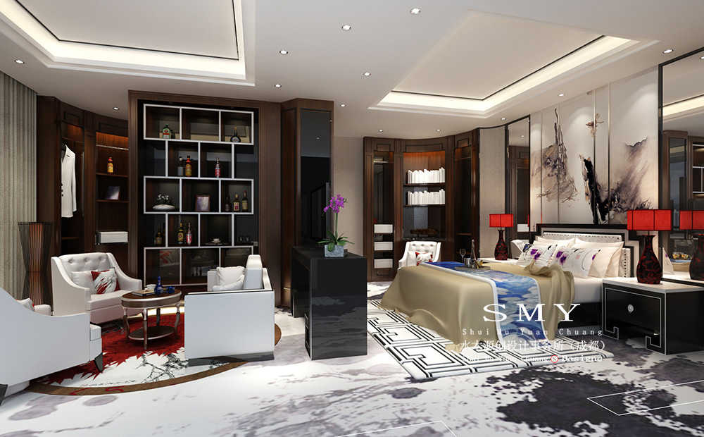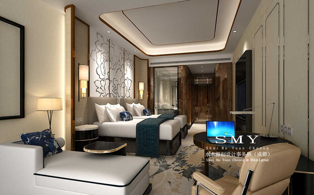就寢區:是客房中設計核心,床是客人使用最長有家具,一般都是在床的中間集中設置控制柜,床頭背后墻面是兩床相對集中的位置,可以進行裝飾處理,另外要配置可調光光的座燈或臺燈、當然壁燈是最好的,頂部射燈,這樣對整個就寢區光環境的塑造是至關重要的;