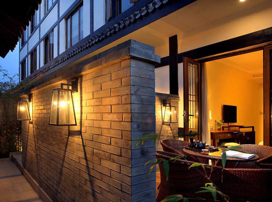 在本案民宿酒店方案設計中,酒店設計師利用建筑原有的框架材料加以裝飾設計,在原來的基礎之上,酒店設計師用現(xiàn)代化的元素對酒店進行了一番勾勒,酒店里的磚墻、照壁、立柱、橫梁、石雕、木雕等都是在原有的基礎之上完整的保留下來的,即使不出酒店,也能深深感覺到這個地方厚重的歷史底蘊。偌大的休閑空間,真是一處讓人閑情雅致的去處。