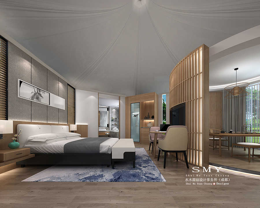 由于帳篷酒店為獨(dú)立建筑,所以我們?cè)谑覂?nèi)設(shè)計(jì)中,沒有采用全隔斷式的分區(qū)設(shè)計(jì),而是采用半封閉式的屏風(fēng)隔斷客房與功夫茶桌,而在洗浴部分我們采用落地式全玻璃隔斷,一方面等有效阻隔潮水,另一方面采光環(huán)境也比較好。當(dāng)然還是需要烤爐隱私問題,所以在設(shè)計(jì)中落地式玻璃內(nèi)都設(shè)計(jì)有多層窗簾以及隱私百葉窗等。