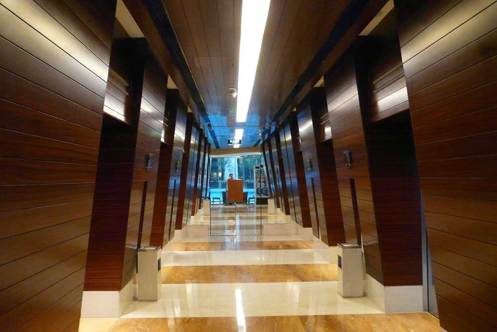 一、電梯廳和設(shè)備不僅僅是客人在酒店生活的交通工具,更是酒店的品味和檔次的體現(xiàn),這些都要考慮它們的位置、數(shù)量、大小、舒適度和便捷等幾個(gè)方面參考國(guó)外的經(jīng)驗(yàn)來看,電梯臺(tái)數(shù)一般都在0.7部/100間客房。但在實(shí)際的工程中往往考慮到九丹的檔次和旅客的方便使用等原因,將電梯每4-6部分布置在電梯廳的兩側(cè)。電梯的寬一般4米左右較合適,可以考慮電梯的內(nèi)部的裝飾采用類似鏡面的鋼材,方便賓客調(diào)整著裝電梯的燈光布置要與走廊的有所提高。國(guó)內(nèi)的旅客大多都喜歡攜帶行李箱所以電梯不易太窄,一般選用2米X1.5米的寬較為合適。