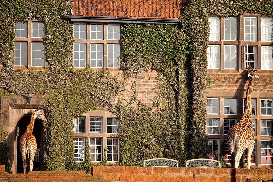 (3) 肯尼亞(長頸鹿莊園)莊園創辦于20世紀30年代,現在酒店的長頸鹿有7只還有大量的雀鳥等野生動物,主要的特色是酒店有許多的又大又開楊的窗戶,方便長頸鹿探頭進入房間,與人互動。