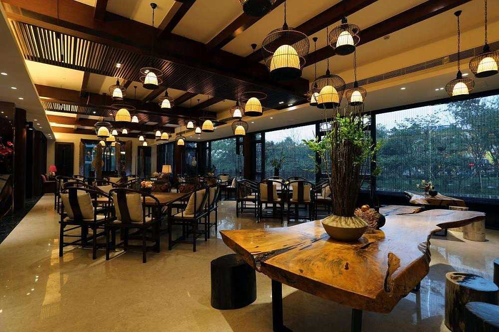 酒店以新中式的風(fēng)格設(shè)計(jì),室內(nèi)自然有一股淡淡的茶香味,和一絲絲優(yōu)雅、禪意氣息。酒店以最大哈的采用原木木料為建筑的主要設(shè)計(jì)材料,在裝飾上采傳統(tǒng)通中式的裝點(diǎn)茶具、檀香、插花、水墨畫、屏風(fēng)等元素,在這個(gè)原本只屬于酒店大堂一隅的空間,營造出了一個(gè)平靜的禪茶世界。